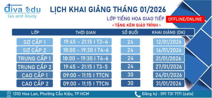 Cùng TIẾNG HOA DU HỌC ĐÌNH VÂN cập nhật lịch khai giảng các khóa học TIẾNG HOA GIAO TIẾP ONLINE/OFFLINE vào tháng 01 tới. Các bạn học viên hãy lựa chọn cho mình lịch học phù hợp nhất nhé!