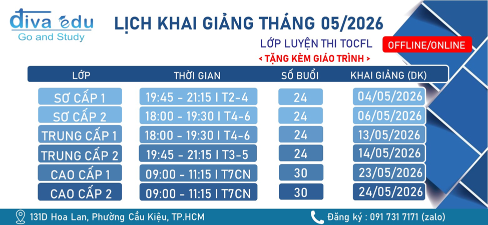 Cùng TIẾNG HOA DU HỌC ĐÌNH VÂN cập nhật lịch khai giảng và học phí các khóa luyện thi TIẾNG HOA TOCFL ONLINE/OFFLINE vào tháng 05 năm nay. Các bạn học viên hãy lựa chọn cho mình lịch học phù hợp nhất nhé!