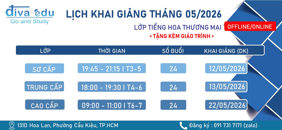 Cùng TIẾNG HOA DU HỌC ĐÌNH VÂN cập nhật lịch khai giảng các khóa học TIẾNG HOA THƯƠNG MẠI ONLINE/OFFLINE vào tháng 5 này. Các bạn học viên hãy lựa chọn cho mình lịch học phù hợp nhất nhé!