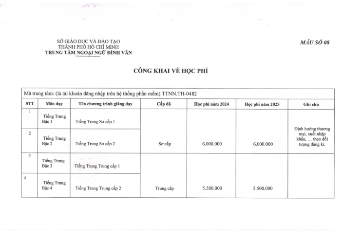Thực hiện quy định tại Thông tư số 09/2024/TT-BGDĐT của Bộ Giáo dục và Đào tạo về công khai trong hoạt động của các cơ sở giáo dục thuộc hệ thống giáo dục quốc dân, Trung tâm Ngoại ngữ Đình Vân công bố những thông tin công khai sau: