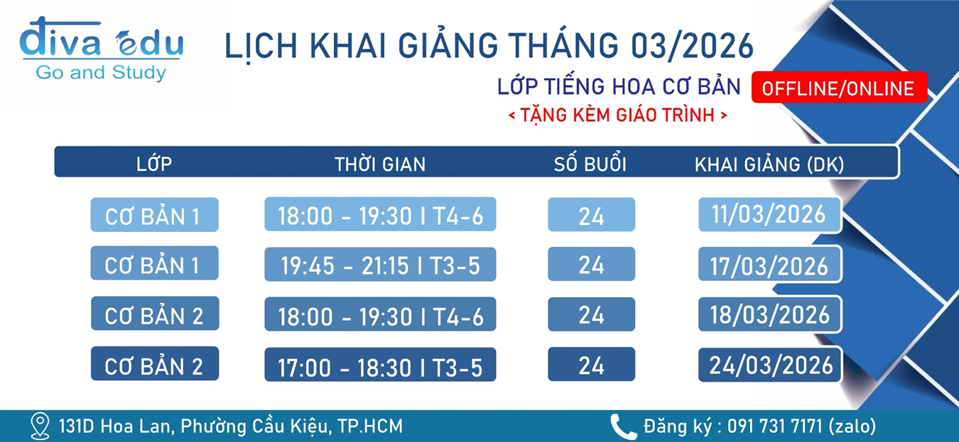Cùng TIẾNG HOA DU HỌC ĐÌNH VÂN cập nhật lịch khai giảng các khóa học TIẾNG HOA CƠ BẢN ONLINE/OFFLINE vào tháng 03 tới. Các bạn học viên hãy lựa chọn cho mình lịch học phù hợp nhất nhé!