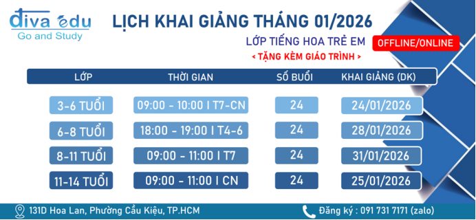 Cùng TIẾNG HOA DU HỌC ĐÌNH VÂN cập nhật lịch khai giảng các khóa học TIẾNG HOA TRẺ EM ONLINE/OFFLINE vào tháng 01 này. Các bạn học viên hãy lựa chọn cho mình lịch học phù hợp nhất nhé!