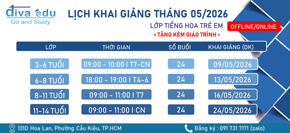 LỊCH KHAI GIẢNG CÁC LỚP TIẾNG HOA TRẺ EM THÁNG 05/2026